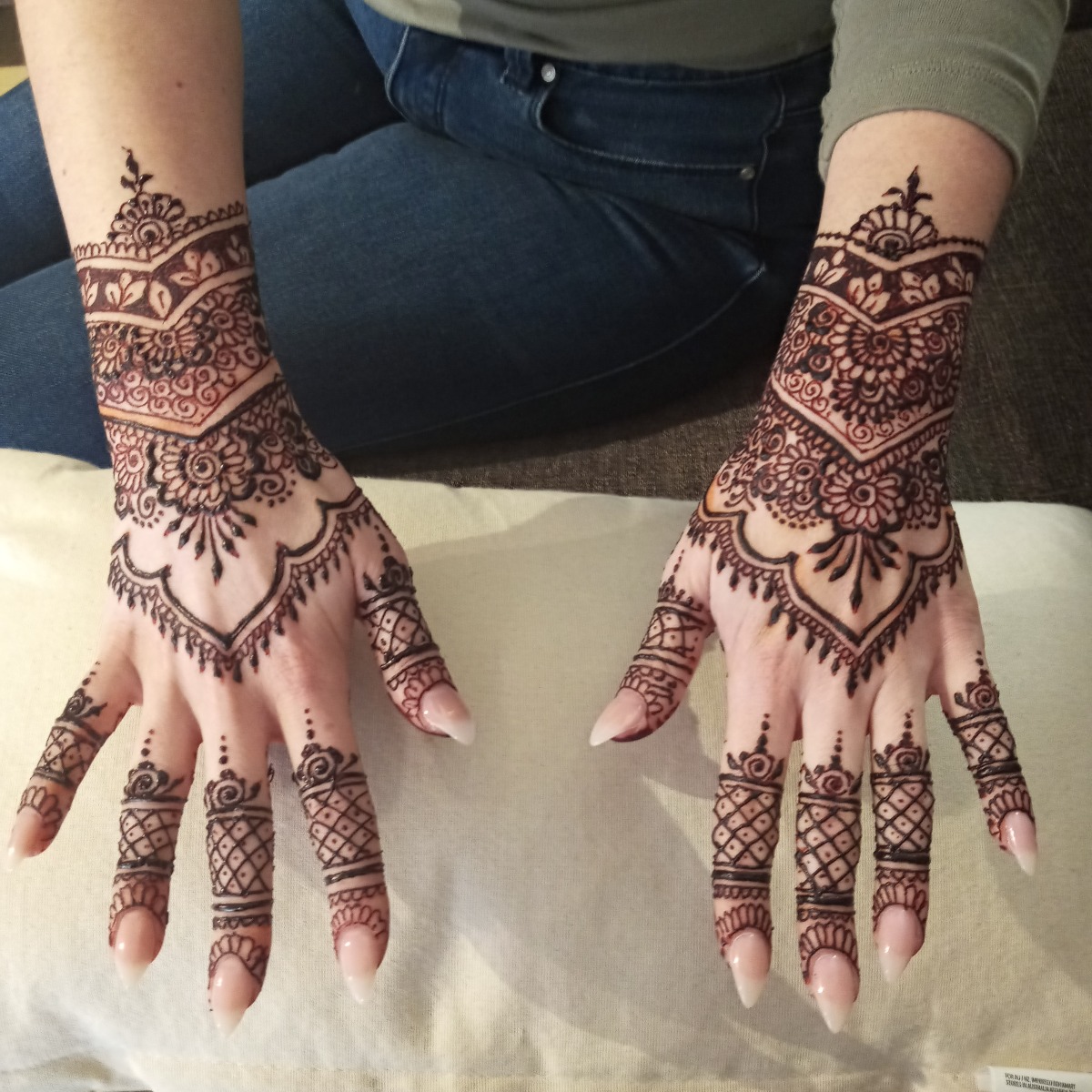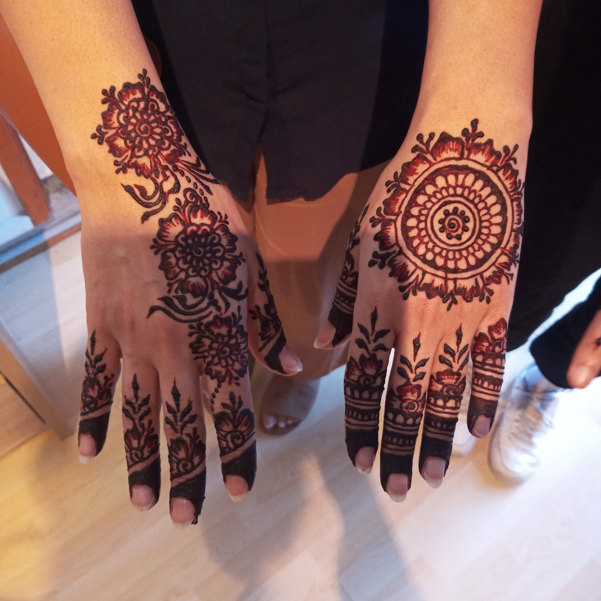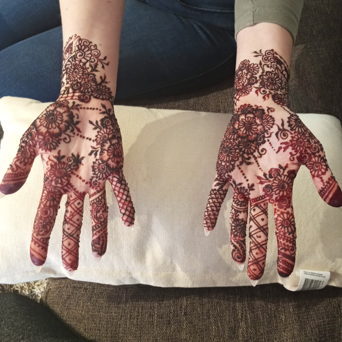 Henna is commonly used for body art, particularly in the form of intricate designs or tattoos. A henna application typically involves creating decorative patterns on the skin using henna paste. Henna, also known as mehndi, plays a significant role in many wedding traditions and ceremonies, particularly in South Asian, Middle Eastern, and North African cultures. Applying henna designs to the bride’s hands and feet, and sometimes to the groom’s hands, is a long-standing tradition that carries deep cultural and symbolic meanings. I have a lot of sample henna work available for you to see in my Children’s Face Painting Page.