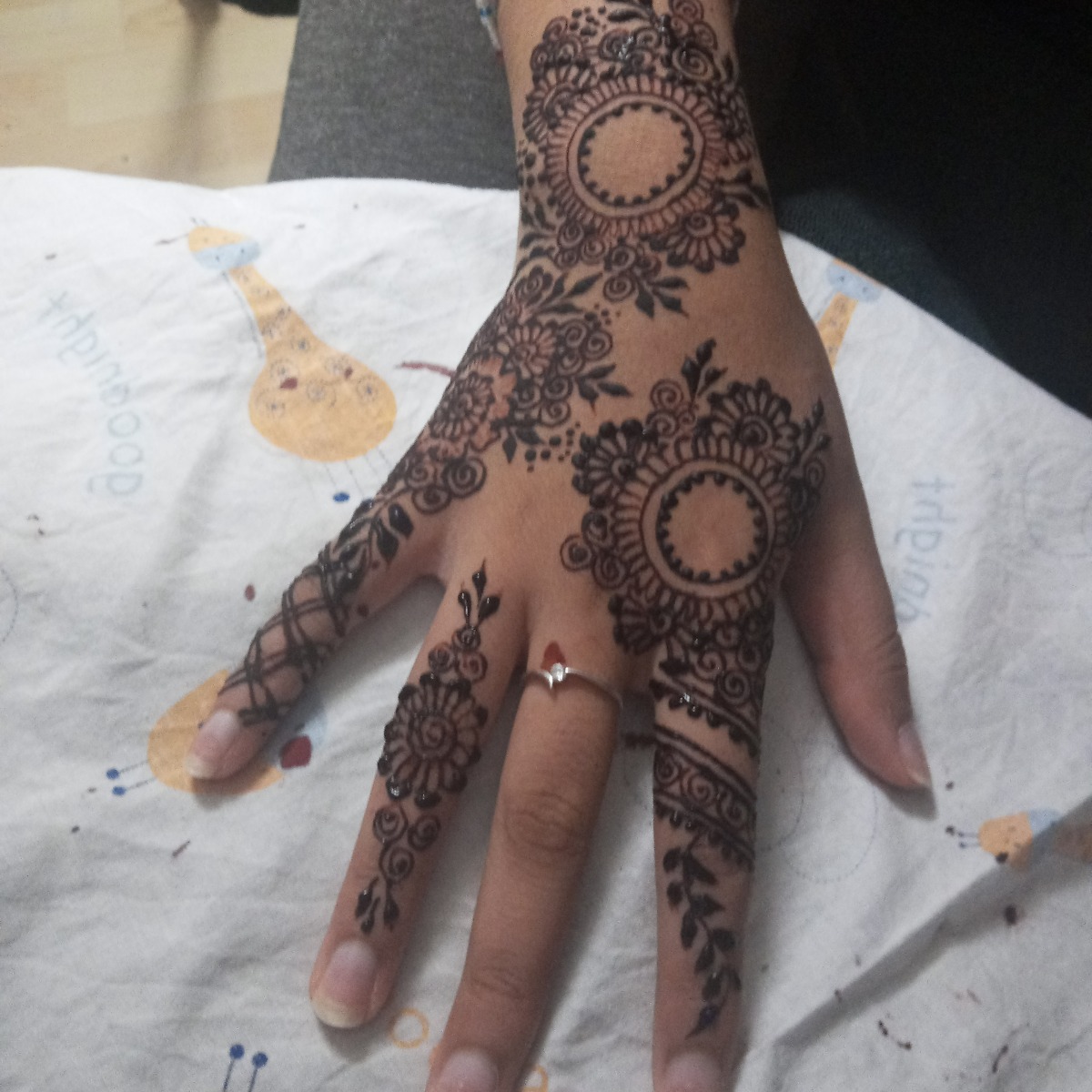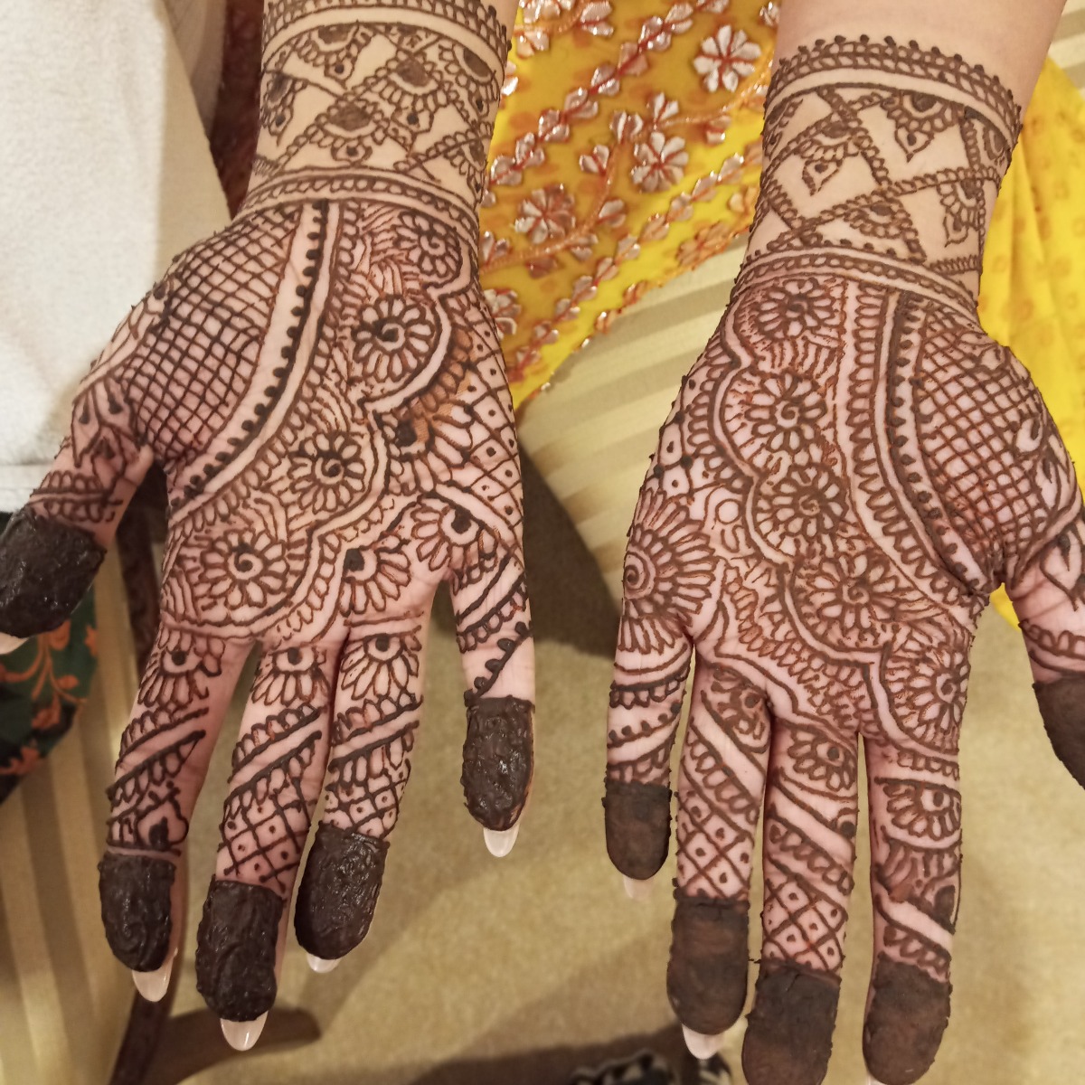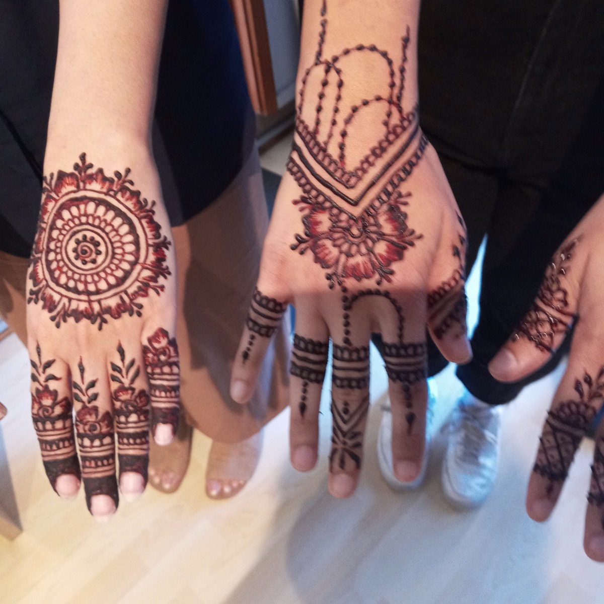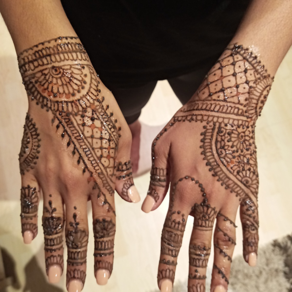 Henna is commonly used for body art, particularly in the form of intricate designs or tattoos. A henna application typically involves creating decorative patterns on the skin using henna paste. Henna, also known as mehndi, plays a significant role in many wedding traditions and ceremonies, particularly in South Asian, Middle Eastern, and North African cultures. Applying henna designs to the bride’s hands and feet, and sometimes to the groom’s hands, is a long-standing tradition that carries deep cultural and symbolic meanings. I have a lot of sample henna work available for you to see in my Children’s Face Painting Page.
